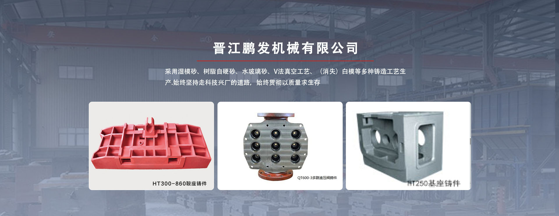 鵬發(fā)機(jī)械鑄造生產(chǎn)鞋機(jī)、大圓針織機(jī)、液壓機(jī)、數(shù)控機(jī)床、CNC加工中心配件。鵬發(fā)機(jī)械鑄造采用濕模砂、樹脂自硬砂、水玻璃砂、V法真空工藝、(消失)白模等多種鑄造工藝生產(chǎn)。鑄件材質(zhì)有:多種牌號(hào)灰口鑄鐵、多種牌號(hào)球墨鑄鐵、鑄鋼件,同時(shí)也生產(chǎn)低合金鋼、高錳鋼等材質(zhì)鑄件。員工120人,其中技術(shù)人員12人。具有雄厚的技術(shù)力量、先進(jìn)的檢測(cè)儀器及完善的管理體系。現(xiàn)有設(shè)備:2T中頻感應(yīng)電爐3套6爐,雙臂樹脂自硬混砂機(jī)3套,S114混砂機(jī)3套,V法真空鑄造生產(chǎn)線造型工作臺(tái)6站,拋丸、水力清理鑄件5套,退火設(shè)備1條,爐前鐵液質(zhì)量管理儀,高頻紅外碳硫分析儀,微機(jī)高速分析儀,熔煉測(cè)溫儀,布氏、洛氏硬度計(jì),金相、拉力試驗(yàn)機(jī),光譜儀等生產(chǎn)、檢測(cè)設(shè)備齊全。